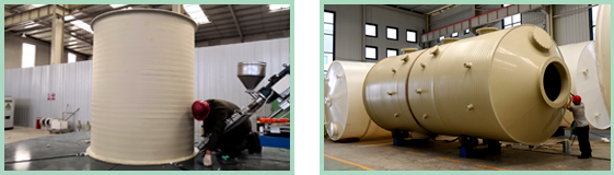 采用PPH螺旋擠出纏繞技術加工制作而成的全塑結構的耐腐蝕塔器或常壓儲罐;取代了板材二次成型的舊工藝。